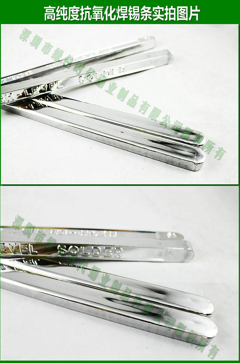 一、   深圳市綠色時代錫業制品有限公司所生産的焊錫條是我司集多年焊錫條的研究和實踐經驗,結合現代電子行業的發展方向和高可靠性產品的要求,採用高純度的金屬純錫和純鉛,經特殊的工藝製成的。它主要適用於各種波峰焊和用手工浸焊。